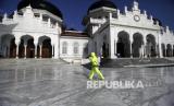 Petugas melakukan penyemprotan cairan disinfektan di komplek Masjid Baiturrahman, Banda Aceh, sebelum pelaksanaan ibadah shalat Jumat, (20/3).( EPA-EFE/Hotli Simanjuntak) (FOTO : EPA-EFE/Hotli Simanjuntak)