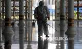 Petugas melakukan penyemprotan cairan disinfektan di komplek Masjid Baiturrahman, Banda Aceh, sebelum pelaksanaan ibadah shalat Jumat, (20/3). (FOTO : EPA-EFE/Hotli Simanjuntak)