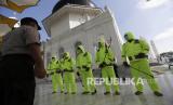 REPUBLIKA.CO.ID, BANDA ACEH -- Petugas melakukan penyemprotan cairan disinfektan di komplek Masjid Raya Baiturrahman, Banda Aceh, sebelum pelaksanaan ibadah shalat Jumat, (20/3).