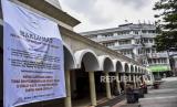 Pengurus Dewan Kemakmuran Masjid (DKM) Masjid Raya Bandung memasang spanduk maklumat yang berisi penghentian sementara sholat jumat dan sholat wajib di area Masjid Raya Bandung, Jalan Dalem Kaum, Kota Bandung, Jumat (20/3). (Republika/Abdan Syakura) (FOTO : Republika/Abdan Syakura)
