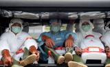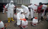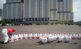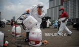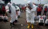 REPUBLIKA.CO.ID, JAKARTA -- Petugas Palang Merah Indonesia (PMI) bersiap untuk penyemprotan cairan disinfektan pada Wisma Atlet di Kemayoran, Jakarta, Sabtu (21/3).