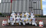 Sejumlah relawan Badan Nasional Penanggulangan Bencana (BNPB) membawa tulisan Kami Tetap Bekerja Untuk Kalian, Kalian Tetap di Rumah Untuk Kami di Wisma Atlet, Kemayoran, Jakarta, Sabtu (21/3/2020). (Antara/M Risyal Hidayat) (FOTO : Antara/M Risyal Hidayat)