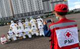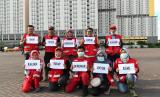 Sejumlah petugas Palang Merah Indonesia (PMI) membawa tulisan Kami Tetap Bekerja Untuk Kalian, Kalian Tetap di Rumah Untuk Kami di Wisma Atlet, Kemayoran, Jakarta, Sabtu (21/3/2020). (Antara/M Risyal Hidayat) (FOTO : Antara/M Risyal Hidayat)