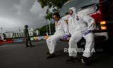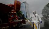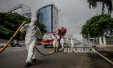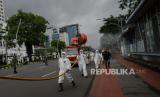Petugas gabungan menyemprotkan cairan disinfektan di Jalan Medan Merdeka Utara, Jakarta, Ahad (22/3). Pemerintah Provinsi DKI Jakarta melakukan penyemprotan secara masif di lima wilayah kota Jakarta yakni Jakarta Pusat, Jakarta Selatan, Jakarta Barat, Jakarta Timur, dan Jakarta Utara guna mencegah penyebaran virus corona (COVID19) yang semakin masif di wilayah DKI Jakarta. Foto : Thoudy Badai(Thoudy Badai/Republika) (FOTO : Thoudy Badai/Republika)