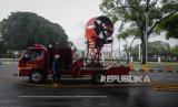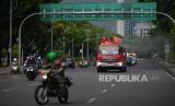 REPUBLIKA.CO.ID, JAKARTA -- Truk pemadam yang dilengkapi kipas besar menyemprotkan cairan disinfektan di kawasan Jalan Medan Merdeka, Jakarta Pusat. Truk damkar khusus yang dilengkapi kipas angin besar berjalan mengelilingi kawasan Monas.