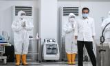Presiden Joko Widodo berada di ruang IGD saat meninjau Rumah Sakit Darurat Penanganan COVID-19 Wisma Atlet Kemayoran, Jakarta, Senin (23/3). (FOTO : Antara/Hafidz Mubarak A)