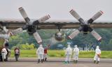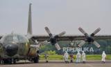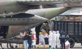 Setelah mendarat di Lanud Halim Perdanakusuma, sebelas orang petugas bersiap-siap untuk melakukan penyemprotan cairan disinfektan kepada awak pesawat dan pesawat Hercules.