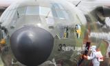 Petugas PMI menyemprotkan cairan disinfektan pada pesawat C-130 Hercules TNI AU dari Skadron Udara 32 Wing Udara 2 Lanud Abdulrachman Saleh Malang yang membawa alat kesehatan untuk penanganan COVID-19 setibanya di Lanud Halim Perdanakusuma, Jakarta, Senin (23/3). (FOTO : ANTARA/m risyal hidayat)