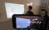Seorang dosen melakukan siarang langsung (live streaming) pembelajaran untuk mahasiswa di kampus AMIK Purnama Niaga di Indramayu, Jawa Barat, Senin (23/3/2020). (FOTO : ANTARA/DEDHEZ ANGGARA)