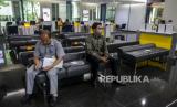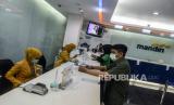 Petugas saat melayani nasabah di Plaza Mandiri, Jakarta, Senin (23/3). Bank Mandiri menyesuaikan jam operasional kantor cabang di seluruh Indonesia mulai Senin, (23/3). (FOTO : Putra M. Akbar/Republika)