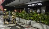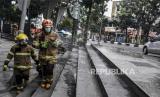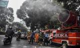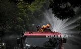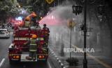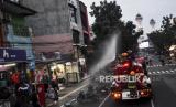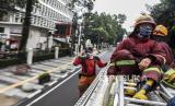 REPUBLIKA.CO.ID, BANDUNG -- Petugas dari Dinas Pemadam Kebakaran dan Penanggulangan Bencana (Diskar PB) Kota Bandung berada di atas mobil pemadam saat kegiatan penyemprotan disinfektan di ruas Jalan Merdeka, Kota Bandung, Senin (23/3).