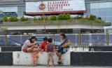 Sejumlah warga bercengkerama di seberang Rumah Sakit Darurat Penanganan COVID-19, Wisma Atlet Kemayoran, Jakarta, Selasa (24/3/2020). Berdasarkan data yang dirilis pemerintah, hingga Selasa (24/3) pagi sebanyak 102 pasien ditangani di rumah sakit darurat itu, 71 orang diantaranya langsung dirawat (FOTO : ANTARA/Aditya Pradana Putra/aww.)