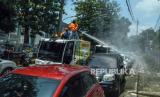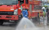 Petugas pemadam kebakaran (Damkar) melakukan penyemprotan cairan disinfektan di pedestrian Jalan Sultan Agung, Bekasi, Jawa Barat, Selasa (24/3/2020). (FOTO : Antara/Suwandy)
