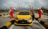 Petugas menyemprotkan cairan disinfektan di kendaraan di pintu keluar tol Adiwerna, Kabupaten Tegal, Jawa Tengah, Selasa (24/3/2020). Penyemprotan disinfektan oleh GP Anshor dan Polres Tegal di kendaraan dari luar kota tersebut untuk mencegah penyebaran Virus Corona (COVID-19) di wilayah Tegal (FOTO : ANTARA/OKY LUKMANSYAH)