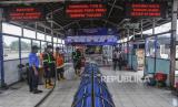 Sejumlah petugas pemadam kebakaran menyemprotkan cairan disinfektan di ruang tunggu terminal Cikarang, Kabupaten Bekasi, Jawa Barat, Selasa (24/3/2020). Penyemprotan ini untuk mencegah wabah COVID-19 di tempat umum (FOTO : ANTARA/fakhri hermansyah)