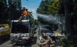 Petugas menggunakan kendaraan penyapu jalan (Road Sweeper) milik Dinas Lingkungan Hidup (DLH) Kabupaten Bogor untuk menyemprotkan cairan disinfektan di Jalan KSR Dadi Kusmayadi, Cibinong, Kabupaten Bogor, Jawa Barat, Selasa (24/3/2020). Penyemprotan disinfektan di jalan tersebut untuk meminimalisir penyebaran COVID-19 di wilayah tersebut (FOTO : ANTARA/Yulius Satria Wijaya)