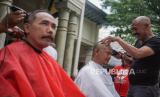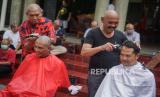 REPUBLIKA.CO.ID, SOLO --Wali Kota Solo, FX Hadi Rudyatmo (kanan), mencukur rambut pejabat daerah Pemerintah Kota Solo saat aksi cukur gundul rambut bersama di Rumah Dinas Wali Kota Loji Gandrung, Solo, Jawa Tengah, Rabu (25/3).