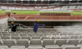Petugas menyemprotkan cairan disinfektan di bangku penonton di Stadion Utama Gelora Bung Karno, Jakarta, Kamis (26/3). Penyemprotan disinfektan itu untuk mengantisipasi penyebaran virus corona atau Covid-19 di lingkungan Stadion Utama Gelora Bung Karno (FOTO : Putra M. Akbar/Republika)