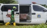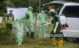 Petugas menyemprotkan cairan disinfektan sebelum membawa peti jenazah pasien suspect Corona ke liang lahat di Tempat Pemakaman Umum (TPU) Tegal Alur, Kalideres, Jakarta, Kamis (26/3). TPU Tegal Alur merupakan salah satu lahan pemakaman yang disediakan oleh Pemerintah Provinsi (Pemprov) DKI Jakarta bagi pasien yang meninggal karena Corona atau Covid-19 (FOTO : Republika/Putra M. Akbar)
