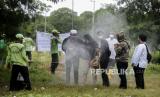 Sejumlah keluarga jenazah pasien suspect Corona disemprot cairan disinfektan oleh petugas di Tempat Pemakaman Umum (TPU) Tegal Alur, Kalideres, Jakarta, Kamis (26/3). TPU Tegal Alur merupakan salah satu lahan pemakaman yang disediakan oleh Pemerintah Provinsi (Pemprov) DKI Jakarta bagi pasien yang meninggal karena Corona atau Covid-19 (FOTO : Republika/Putra M. Akbar)