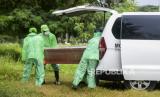 Petugas mengangkat peti jenazah pasien suspect Corona di Tempat Pemakaman Umum (TPU) Tegal Alur, Kalideres, Jakarta, Kamis (26/3). TPU Tegal Alur merupakan salah satu lahan pemakaman yang disediakan oleh Pemerintah Provinsi (Pemprov) DKI Jakarta bagi pasien yang meninggal karena Corona atau Covid-19 (FOTO : Republika/Putra M. Akbar)