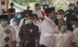 Presiden Joko Widodo menyapa pelayat usai mengikuti prosesi pemakaman di komplek pemakaman keluarga Dukuh Mandu, Desa Nolligaten, Gondangrejo, Karanganyar, Jawa Tengah, Kamis (26/3/2020). Almarhum Ibunda Presiden Joko Widodo, Sujiatmi Notomiharjo meninggal dunia pada rabu (25/3) pukul 16:45 WIB pada usia 77 tahun karena kanker (FOTO : ANTARA/Mohammad Ayudha)