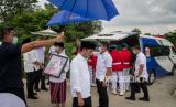 Presiden Joko Widodo (ketiga kiri) berserta Putra Sulung Gibran Rakabuming Raka (kedua kiri) saat tiba dikomplek pemakaman keluarga di Dukuh Mandu, Desa Nolligaten, Gondangrejo, Karanganyar, Jawa Tengah, Kamis (26/3/2020). Almarhum Ibunda Presiden Joko Widodo, Sujiatmi Notomiharjo meninggal dunia pada rabu (25/3) pukul 16:45 WIB pada usia 77 tahun karena kanker (FOTO : ANTARA/Mohammad Ayudha)
