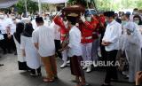 Di depan peti jenazah yang diangkat oleh personel Paspampres terlihat putra sulung Joko Widodo, Gibran Rakabuming membawa foto almarhum Sudjiatmi.