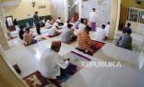Jamaaah Masjid Al Furqan berdzikir usai pelaksanaaan shalat Jumat di Kompleks Jaka Purwa, Kecamatan Bandung Kidul, Bandung, Jumat (27/3). DKM setempat masih menggelar ibadah shalat Jumat dengan menerapkan kaidah physical distancing antar shaf untuk mengurangi penyebaran wabah corona (FOTO : Yogi Ardhi/Republika)