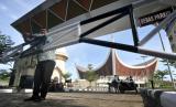 Petugas berjaga di gerbang Masjid Raya Sumatera Barat, di Padang, Jumat (27/3/2020). Majelis Ulama Indonesia (MUI) Sumatera Barat mengeluarkan maklumat meniadakan penyelenggaraan shalat jumat di masjid-masjid di daerah berjangkitnya COVID-19 di provinsi itu, menyusul bertambahnya warga yang positif menjadi lima orang, meliputi dua orang dari Bukittinggi, dan masing-masing satu orang dari Padang, Tanah Datar, dan Pesisir Selatan (FOTO : Antara/Aprillio Akbar)