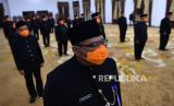 Sejumlah Aparatur Sipil Negara (ASN) eselon III dan IV mengikuti pengambilan sumpah jabatan di Gedung Negara Grahadi, Surabaya, Jawa Timur, Jumat (27/3/2020). Pengambilan sumpah tersebut dilaksanakan dengan mengenakan masker dan setiap peserta berjarak satu meter untuk mengantisipasi penyebaran Virus Corona (COVID-19) (FOTO : ANTARA/Zabur Karuru)