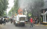 Petugas dan relawan PMI melakukan penyemprotan disinfektan dengan menggunakan mobil blower milik PMI di wilayah Kecamatan Johar Baru, Jakarta Pusat, Sabtu (28/03). Penyemprotan disinfektan ini cukup efektif untuk memutus mata rantai penyebaran virus covid 19. (FOTO : Tim Media JK)