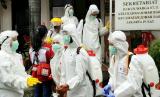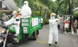 Petugas dan relawan PMI melakukan penyemprotan disinfektan di Kelurahan Kalibata, Kecamatan Pancoran Jakarta Selatan, Sabtu (28/03). Penyemprotan disinfektan ini cukup efektif untuk memutus mata rantai penyebaran virus covid 19. (FOTO : Tim Media JK)
