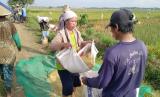 Buruh panen padi menghitung gabah hasil panen di Blok Ki Buyut Depong, Desa Terusan, Kecamatan Sidang, Kabupaten Indramayu, Provinsi Jabar, Sabtu (28/3). Untuk tiap satu karung gabah kering hasil panen dengan berat 55 kg, para buruh panen padi ini menerima upah sebesar Rp. 264 ribu. (FOTO : Agus Yulianto/Republika)