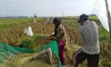 Buruh panen padi memanen padi di Blok Ki Buyut Depong, Desa Terusan, Kecamatan Sidang, Kabupaten Indramayu, Provinsi Jabar, Sabtu (28/3). Untuk tiap satu karung gabah kering hasil panen dengan berat 55 kg, para buruh panen padi ini menerima upah sebesar Rp. 264 ribu. (FOTO : Agus Yulianto/Republika)