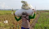Buruh panen padi mengangkut karung berisi gabah hasil panen padi di Blok Ki Buyut Depong, Desa Terusan, Kecamatan Sidang, Kabupaten Indramayu, Provinsi Jabar, Sabtu (28/3). Untuk tiap satu karung gabah kering hasil panen dengan berat 55 kg, para buruh panen padi ini menerima upah sebesar Rp. 264 ribu. (FOTO : Agus Yulianto/Republika)