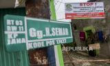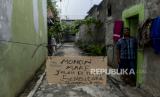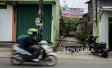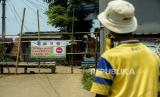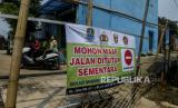REPUBLIKA.CO.ID, BEKASI -- Warga melintas di dekat spanduk penutupan jalan menuju Kampung Jaha di kawasan Jatiasih, Bekasi, Jawa Barat, Ahad (29/3).