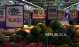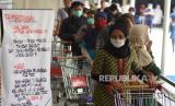 Warga berbelanja saat pemberlakuan pembatasan pengunjung supermarket di Tiptop, Depok, Jawa Barat, Senin (30/3/2020). Pembatasan jumlah pengunjung yang berbelanja tersebut untuk mencegah penyebaran COVID-19 (FOTO : Indrianto Eko Suwarso/ANTARA FOTO)