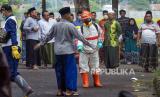 Petugas menyemprotkan cairan disinfektan kepada santri yang baru datang di Kabupaten Pekalongan, Jawa Tengah, Selasa (31/3/2020). Pemerintah setempat melakukan cek suhu badan dan penyemprotan cairan disinfektan kepada rombongan 15 bus berisi sekitar 800 orang santri asal Kabupaten Pekalongan yang pulang dari Pondok Pesantren (Ponpes) Api Tegal Rejo Magelang dan Ponpes Lir Boyo Kediri untuk mencegah penyebaran wabah virus Corona (COVID-19) (FOTO : ANTARA FOTO)