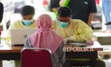 Petugas Labkesda Provinsi Jawa Barat mendata peserta tes cepat Covid-19 di kompleks Gedung Sate, Bandung, Selasa (31/3). Pemprov Jawa Barat melakukan uji cepat Covid-19 terhadap Aparatur Sipil Negara (ASN) dan awak media yang bekerja di Komplek Pemerintahan Gedung Sate untuk mengantisipasi penyebaran SARS CoV-2 penyebab Covid-19 (FOTO : Yogi Ardhi/Republika)
