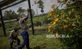 Espoir Watukalusu, petugas perawat di Pusat Konservasi Primata Lwiro, melemparkan jeruk untuk makanan para simpanse di Lwiro, Kivu Selatan, Republik Demokratik Kongo, Kamis (5/3). Keberadaan simpanse di Kongo terancam punah oleh penggundulan hutan dan perburuan liar (FOTO : EPA-EFE/HUGH KINSELLA CUNNINGHAM)