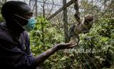 Simon Ngabo, petugas perawat primata memberi makan seekor monyet ekor merah, di pusat konservasi primata Lwiro di Lwiro, Kivu Selatan, Republik Demokratik Kongo, Kamis (5/3). Keberadaan simpanse di Kongo terancam punah oleh penggundulan hutan dan perburuan liar (FOTO : EPA-EFE/HUGH KINSELLA CUNNINGHAM)