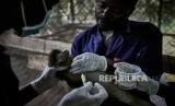 Petugas melakukan pengobatan kepada seekor monyet ekor merah, di pusat konservasi primata Lwiro di Lwiro, Kivu Selatan, Republik Demokratik Kongo, Kamis (5/3). Keberadaan simpanse di Kongo terancam punah oleh penggundulan hutan dan perburuan liar. (FOTO : EPA-EFE/HUGH KINSELLA CUNNINGHAM)