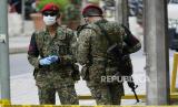 Pasukan militer berjaga menggunakan masker di pintu masuk kondominium City One karena telah di lockdown setelah tercatat 17 kasusu COVID-19 di Kuala Lumpur, Malaysia, Selasa (31/3). Pemerintah Malaysia memerintahkan pembatasan pergerakan terhadap masyarakat hingga 15 April, untuk menghindari penyebaran virus Corona (FOTO : AP Photo/Vincent Thian)