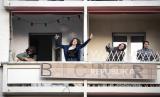 Penyanyi berkebangsaan Swiss Amandine (Rapin) (kedua kiri) melakukan konser singkat di balkonnya saat diberlakukannya keadaan darurat wabah penyakit corona di Lausanne, Swiss, Sabtu (28/3). Negara-negara di seluruh dunia mengambil langkah-langkah pencegahan untuk membendung penyebaran virus corona (FOTO : EPA-EFE/LAURENT GILLIERON)