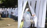 Santriwati melewati bilik penyemprotan disinfektan sebelum dipulangkan ke daerah asal di Pondok Pesantren (Ponpes) Lirboyo, Kota Kediri, Jawa Timur, Selasa (31/3/2020). Ponpes terbesar se-Jawa Timur tersebut memulangkan sedikitnya 22 ribu santri untuk menangkal penyebaran COVID-19 (FOTO : ANTARA/Prasetia Fauzani)