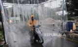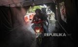 Pengendara motor melewati bilik disinfektan di sebuah kompleks perumahan daerah Bekasi, Jawa Barat, Selasa (31/3/2020). Menurut warga Pemasangan bilik disinfektan sebagai upaya untuk mencegah penyebaran wabah COVID-19 (FOTO : Fakhri Hermansyah/ANTARA FOTO)