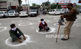 Petugas polisi Jammu dan Kashmir memaksa orang untuk berjongkok di dalam lingkaran yang ditandai untuk menjaga jarak sosial minimum di Jammu, India, Rabu (25/3). Perdana Menteri India Narendra Modi mengumumkan penguncian 21 hari di seluruh India, yang dimulai pada 24 Maret, dalam upaya untuk memperlambat penyebaran pandemi penyakit COVID-19 yang disebabkan oleh coronavirus SARS-CoV-2 (FOTO : EPA)