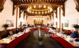 Kabinet Belanda mengadakan pertemuan mingguan di dalam ruang Rolzaal dengan tempat duduk berjarak di Den Haag, Belanda, Jumat (27/3). Meskipun kabinet biasanya bertemu di ruang Treves, pemerintah telah memutuskan untuk beralih ke ruang yang lebih besar. (FOTO : ANP POOL)