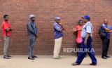 Seorang perwira polisi memerintahkan pembeli untuk menjaga jarak sosial saat antre di Harare, Zimbabwe, Senin (30/3). Negara Afrika memasuki hari pertama 21 hari penutupan secara nasional yang diputuskan oleh Presiden Emmerson Mnangagwa di upaya untuk memperlambat penyebaran penyakit pandemi COVID-19 yang disebabkan oleh coronavirus SARS-CoV-2. (FOTO : EPA)